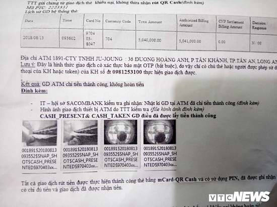 Cảm thấy câu trả lời của nhân viên ngân hàng không thỏa đáng, anh Vương liên tục làm đơn khiếu nại. Lúc này, Ngân hàng Sacombank cho kiểm tra lại hệ thống thì phát hiện số tiền bị mất không phải được chuyển qua máy tính mà rút trực tiếp từ 1 cây ATM ở TP Tân An (Long An).