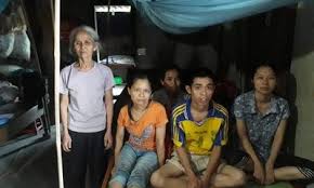 Nhìn 4 đứa con ngồi bệt bên góc nhà, nhõng nhẽo đòi cơm, bà Nguyễn Thị Hường (67 tuổi), trú tại thôn Giang Thuỷ, xã Thanh Giang, huyện Thanh Chương, tỉnh Nghệ An vội vào bếp lấy mấy củ khoai lang ra chia cho các con ăn. Có đứa vừa ăn, vừa phun nước dãi vào mặt bà rồi phá lên cười, có đứa thì vừa cắn được miếng đã nhè ra đất xong nhặt ăn... Phải dỗ mãi 4 đứa mới chịu ngồi yên cho bà tiếp khách.