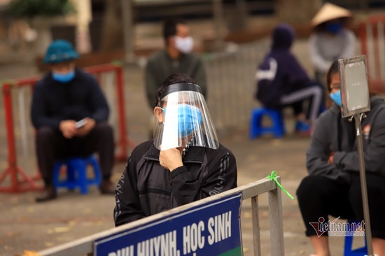 Sáng 31/3, tại trạm xét nghiệm lưu động ở 1 trường THCS ở quận Đống Đa có rất nhiều người dân đứng xếp hàng từ rất sớm để chờ được xét nghiệm.