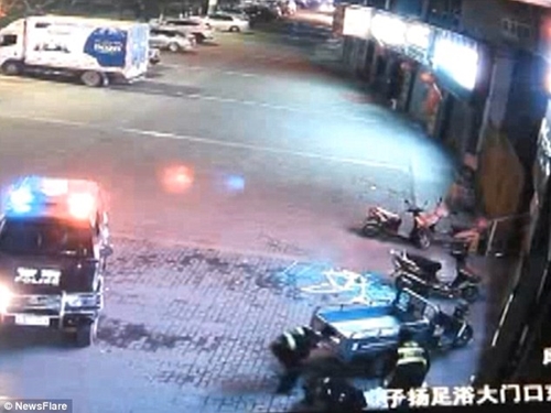 Video do camera giám sát ghi lại cho thấy người phụ nữ đã rơi xuống từ độ cao khoảng 3 mét tại tầng 2 của một phòng mát xa chân ở huyện Kuga, khu tự trị Uyghur Tân Cương, phía Tây Bắc Trung Quốc.