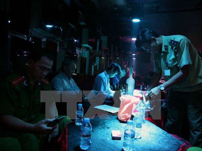 Lực lượng chức năng tiến hành kiểm tra các quán bar lớn. (Ảnh Báo VietnamPlus/TTXVN) |