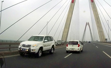 Hình ảnh xe biển xanh đi ngược chiều trên cầu Nhật Tân. (Ảnh: báo Dân trí) |
