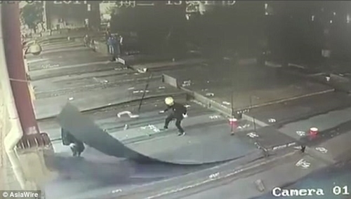 Camera quan sát đã quay được toàn bộ quá trình thoát chết khủng khiếp của người công nhân này khi dây đai móc cẩu treo bị đứt và những tấm thép rơi ra tại chỗ.