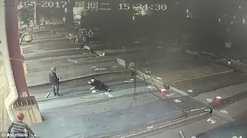 Sự cố trên vừa xảy ra tại một nhà máy ở Phật Sơn, tỉnh Quảng Đông, Trung Quốc. Hai công nhân đang cố gắng dỡ bỏ một móc và dây treo buộc một chồng tấm thép được cần cầu kéo tới. Đột nhiên, chiếc móc bất ngờ đứt gãy và tuột ra khiến một đầu tấm thép bên trên bật lên rất cao. Một công nhân trốn thoát còn người kia thì không trốn kịp nên bị nó đánh mạnh vào đầu. Anh ta ngã lăn ra, mũ bảo hiểm rơi sang một bên.