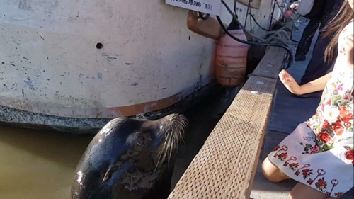 Một con sư tử biển vùng nam California đã bơi đến gần bến tàu và lượn lờ quanh đó. Nó thậm chí còn vươn mình lên để nhìn thẳng cô gái nhỏ đang đứng bên cầu tàu.