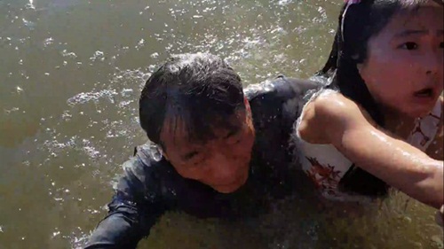 Đám khách du lịch kêu lên vì sợ hãi. Một người đàn ông, chắc là người thân của cô bé, đã ngay lập tức lao xuống nước và cứu cô bé lên. Mọi người nhanh chóng giúp kéo cả hai lên bờ an toàn. Nhưng cả hai người đều run rẩy, hình như họ đã bị sốc.