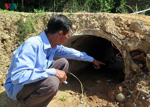 Nhiều hộ dân ở xã Tịnh Hà cũng phản ánh đường dân sinh lên khu vực Núi Ngang chỉ mới qua vài trận mưa đã bị sạt lở, đất, đá trôi xuống bồi lấp ruộng đồng không canh tác được. Tại khu vực này, đơn vị thi công đặt nhiều ống cống thoát nước ngầm dưới đường dân sinh nhưng chất lượng quá kém. Ống cống cũ, vỡ toác, lòi cả sắt thép ra ngoài, nguy hiểm cho người và phương tiện qua lại - Ảnh: VOV. |