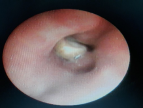 Hình ảnh nội soi cho thấy dị vật bị kẹt ở thùy dưới phổi phải của bà cụ 84 tuổi. |