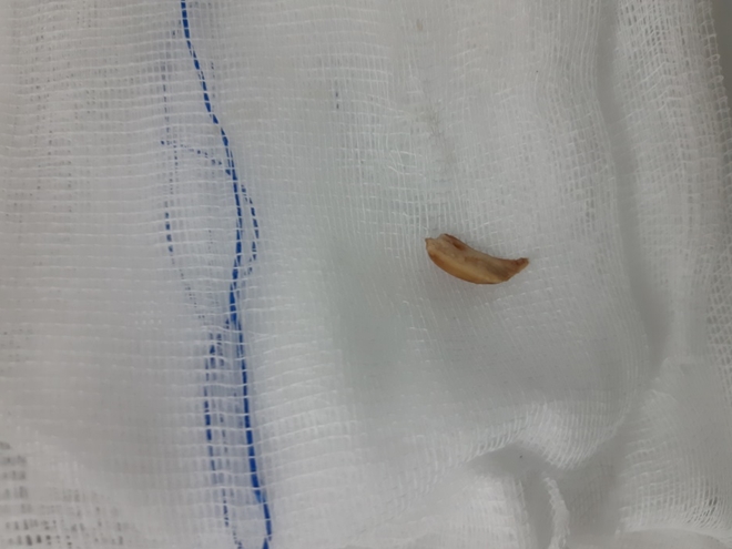 Mảnh hạt sen được các BS lấy ra ngoài có kích cỡ 0,5x0,5x1,2 cm. |