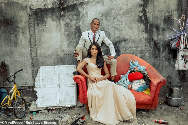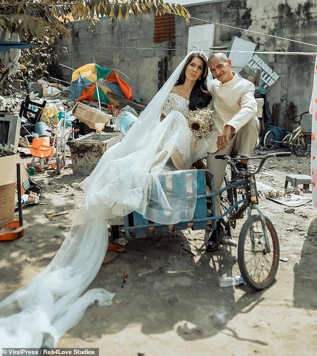 Nhờ có sự giúp đỡ của ông chủ tiệm cắt tóc mà cặp vợ chồng nhặt ve chai Roselyn và Rommel có màn "lột xác" ngoạn mục trong bộ ảnh cưới.