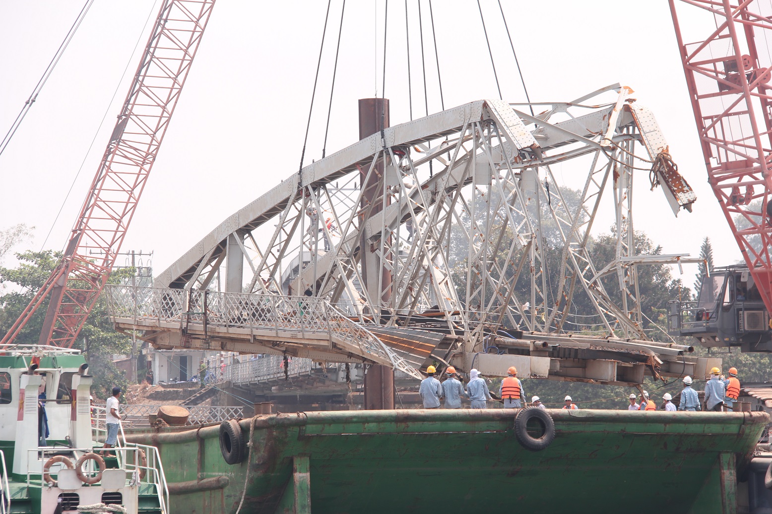 Một nửa nhịp cầu số 3 được trục vớt lên sà lan. Ảnh: Báo Thanh niên. |