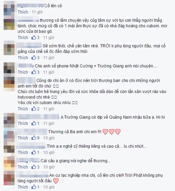 Với chia sẻ của mình, Cát Phượng cũng nhận được nhiều sự động viên, khích lệ của bạn bè, người hâm mộ, mừng cho chị vì đã có được những người anh em, đồng nghiệp đáng quý, đồng thời bày tỏ sự cảm phục trước tấm lòng của Nhật Cường, Trường Giang.