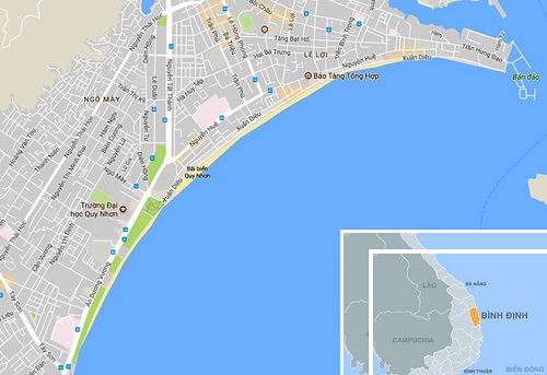 Vị trí vùng biển Quy Nhơn, nơi nhiều tàu hàng và tàu du lịch gặp nạn chìm trong bão số 12. Ảnh: Google Maps. |
