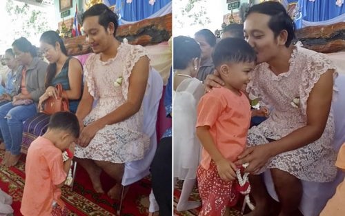 Tuy nhiên, một bài đăng trên mạng xã hội đã thu hút được rất nhiều sự chú ý của cư dân mạng, trong đó, người đàn ông mặc váy, ngồi nhận lễ của cậu con trai ở trường Wat Trai Rattanaram, tỉnh Kanchanaburi.