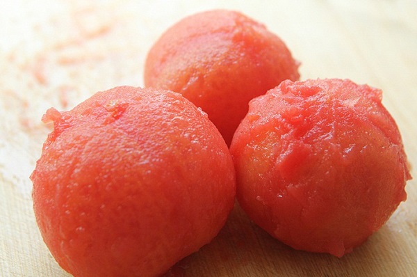 - Bước 2: Cà chua luộc qua rồi bóc bỏ vỏ, thái nhỏ.