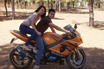| Ksor Úc và bạn gái trên chiếc xe của một người họ hàng. |