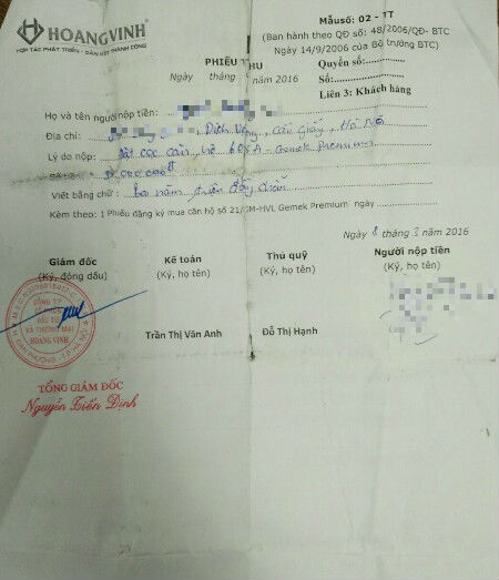 Theo nội dung trên phiếu “Đăng ký mua căn hộ" số: 21/GM-HVL, được ký ngày 8/3/2016, cho thấy, chỉ có mối quan hệ giữa khách hàng là chị Nguyễn Phương H và đơn vị cung cấp dịch vụ là công ty CP đầu tư và thương mại Hoàng Vinh, không hề có sự dính dáng của bất kỳ đơn vị nào khác. Việc ông Trịnh Xuân Minh, PTGĐ công ty “lôi kéo” chủ đầu tư (Công ty CP XNK tổng hợp Hà Nội) và Hội quán Bất động sản vào để giải thích cho việc “găm” 17.500.000 đồng tiền đặt cọc của khách hàng là rất phi lí.