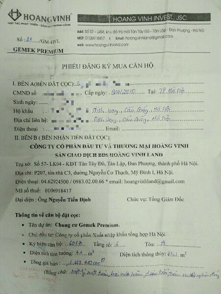 Phiếu đăng ký mua căn hộ của công ty Hoàng Vinh. |