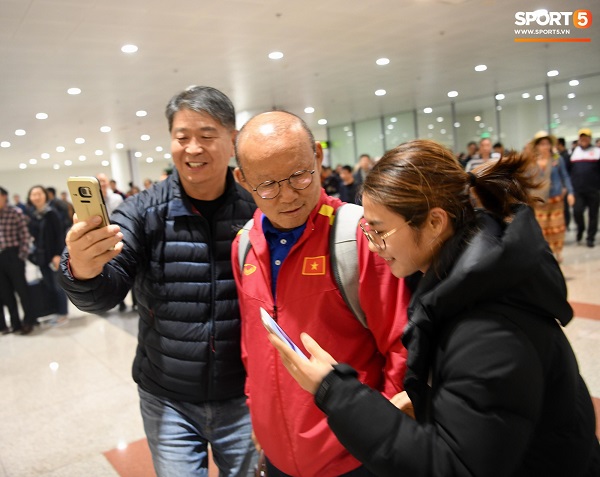 Ngay khi xuất hiện tại sảnh xuất nhập cảnh sân bay Nội Bài, HLV Park Hang-seo đã được CĐV chạy tới xin chụp ảnh cùng. |