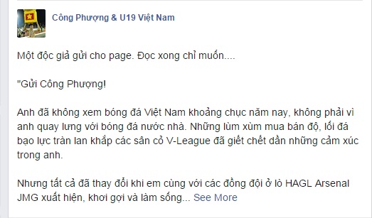 Nhưng tất cả đã thay đổi khi em cùng với các đồng đội ở lò HAGL Arsenal JMG xuất hiện, khơi gợi và làm sống lại thứ cảm xúc tưởng như đã ngủ yên không chỉ với riêng anh, mà của hầu hết NHM bóng đá Việt Nam. Các em đã chơi thứ bóng đá đẹp, với niềm đam mê cháy bỏng và thế hệ vàng Hồng Sơn, Huỳnh Đức… như lại hiện về trong ký ức của NHM.