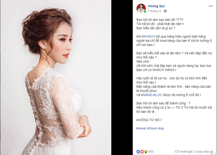 Đối với tôi là người theo dõi Hoàng Quí từ những ngày đầu bắt đầu khởi nghiệp cho đến ngày tạo dựng một thương hiệu có tầm như ngày hôm nay, tôi càng thấy cảm mến và nể phục cô ấy hơn bao giờ hết bởi sự chân chất, mộc mạc nhưng chứa đựng nội lực bên trong. Đôi khi chỉ là những dòng tâm trạng trên facebook cũng làm tôi ghi nhớ.