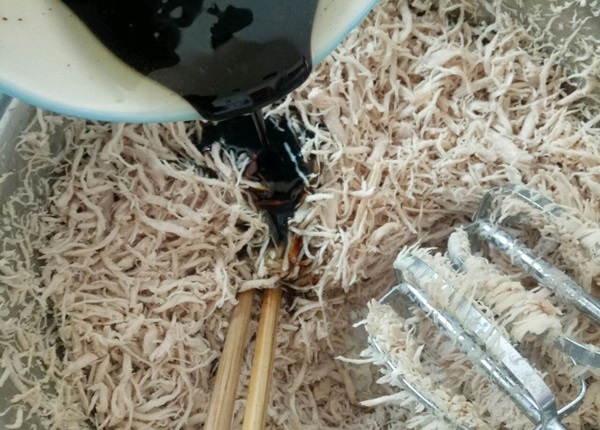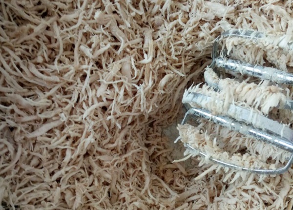 - Bước 2: Xé thịt thành từng sợi nhỏ rồi cho vào thố. Dùng máy đánh trứng đánh tơi thịt.