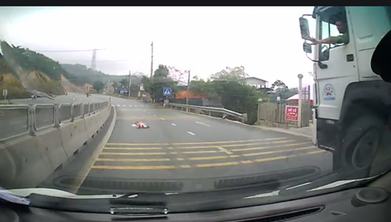 Đến đoạn ngã ba Mông Dương, thì thấy một xe ô tô tải dừng bên lề kèm tín hiệu nhường đường. Cạnh đó có một vật từ từ di chuyển tới dải phân cách.