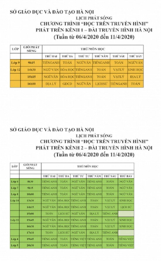 Cụ thể, lịch phát sóng dạy học trực tuyến cho học sinh từ lớp 4 đến lớn 12 trong tuần từ 6/4 - 11/4 như sau: