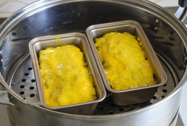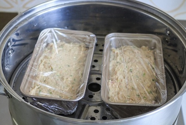 - Bước 4: Đổ tôm thịt đã trộn vào khuôn đã được chống dính. Bọc kín khuôn bằng màng bọc thực phẩm, đặt vào nồi hấp và hấp ở lửa vừa trong khoảng 20 phút.