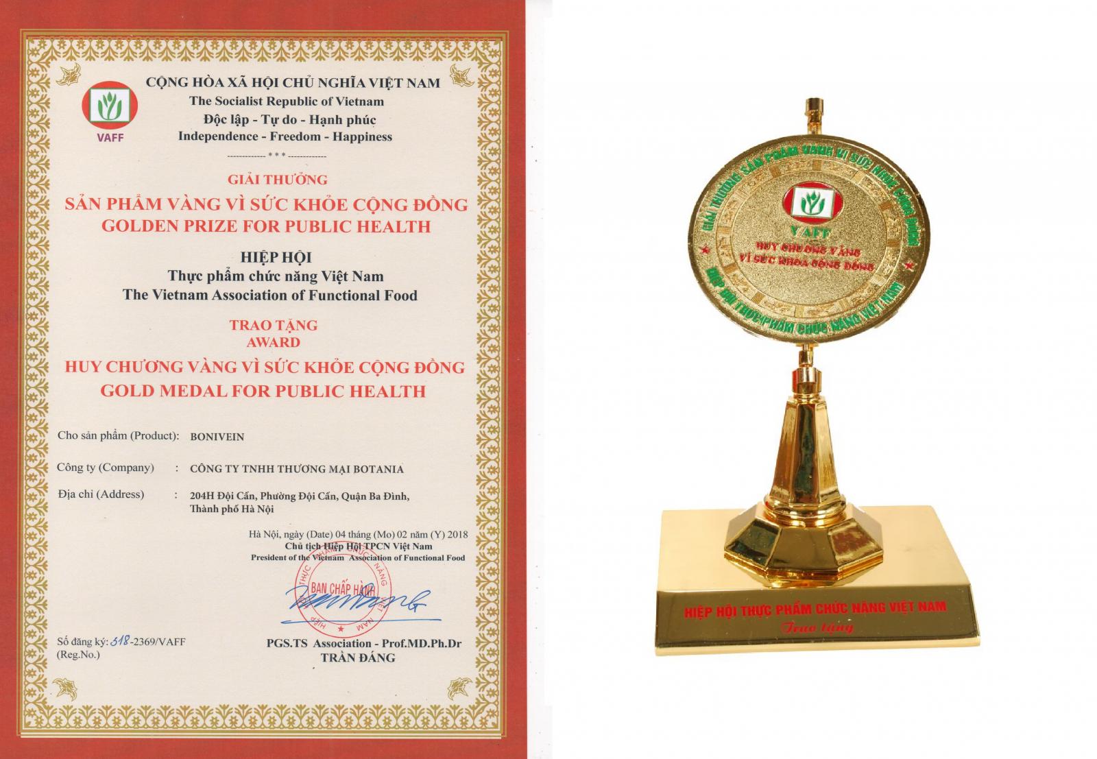 BoniVein không những nhận được sự tin dùng của bệnh nhân mà còn được giới chuyên môn đánh giá cao khi hai năm liên tiếp, tức là năm 2017 và năm 2018 BoniVein vinh dự được nhận cúp và giải thưởng “Sản phẩm vàng vì sức khỏe cộng đồng” do Chủ tịch Hiệp hội Thực phẩm chức năng Việt Nam – PGs.Ts Trần Đáng trao tặng. Đó là niềm tin và động lực để BoniVein tiếp tục cống hiến vì sức khỏe người bệnh.