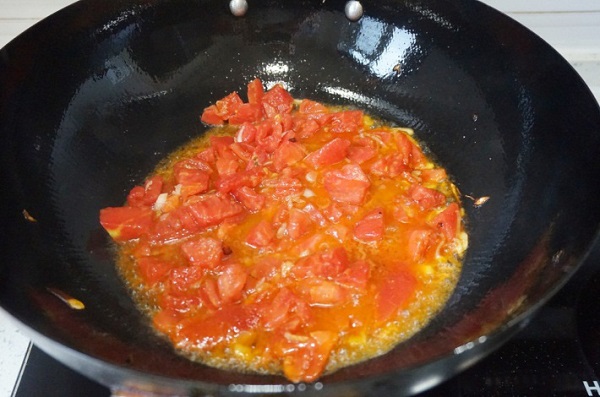 - Bước 1: Đun nóng chút dầu ăn trong chảo, cho gốc hành vào xào thơm. Tiếp đó cho cà chua vào xào mềm.