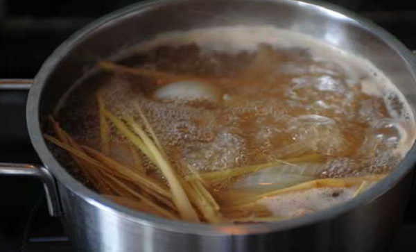 - Bước 7: Cho dầu điều, dầu ăn phi hành khô, một chút tỏi, sả và mắm ruốc cho thơm rồi đổ vào nồi gân bò lấy màu cho đẹp. Nồi này cứ để trên bếp cho nóng.