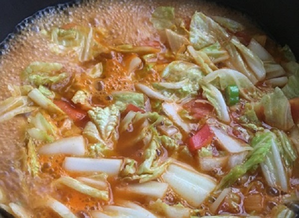 - Bước 2: Đổ cải thảo và cà chua vào. Thêm 1 thìa canh sốt ớt Gochujang vào đảo đều. Đổ lượng nước thích hợp vào đun sôi.