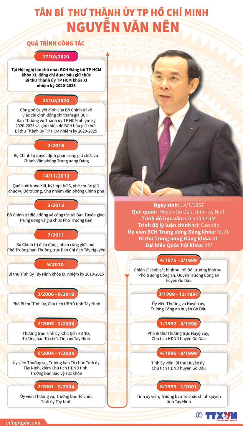 Ngày 11/10 vừa qua, Bộ Chính trị quyết định ông Nguyễn Văn Nên, Bí thư Trung ương Đảng, Chánh Văn phòng Trung ương Đảng thôi giữ chức Chánh Văn phòng Trung ương Đảng. Đồng thời chỉ định tham gia Ban Chấp hành, Ban Thường vụ Thành ủy TPHCM nhiệm kỳ 2020-2025 và giới thiệu để Ban Chấp hành bầu giữ chức Bí thư Thành ủy TPHCM nhiệm kỳ 2020-2025.