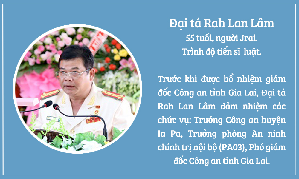 Bộ Công an đã bổ nhiệm Đại tá Rah Lan Lâm - Phó giám đốc Công an tỉnh Gia Lai, giữ chức vụ Giám đốc công an tỉnh này.