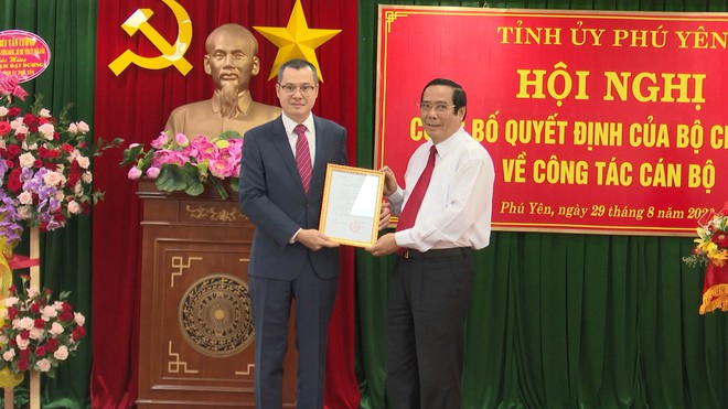 Ông Nguyễn Thanh Bình trao quyết định cho tân Bí thư Tỉnh ủy Phú Yên Phạm Đại Dương (bìa trái). Ảnh: Thanh Niên |