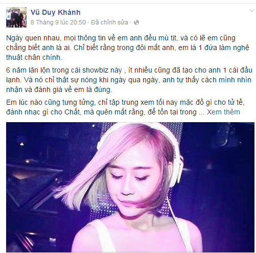Đặc biệt hơn, sau những chia sẻ của Tiên Moon, trên trang cá nhân của Vũ Duy Khánh cũng đăng tải dòng trạng thái với nhiều lời ngọt ngào dành cho DJ Soda Việt Nam.