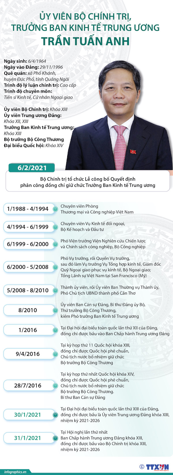 Ngày 5/2/2021, tại Quyết định số 02-QĐNS/TW Bộ Chính trị đã phân công đồng chí Trần Tuấn Anh, Ủy viên Bộ Chính trị, giữa chức Trưởng ban Kinh tế Trung ương.