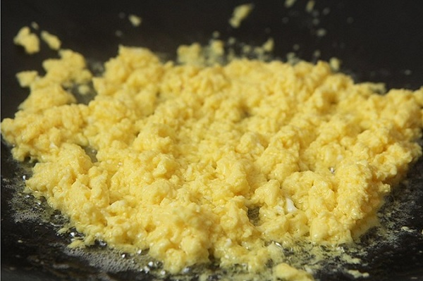- Bước 1: Đun nóng chút dầu ăn trong chảo, đổ trứng vào chiên tơi.