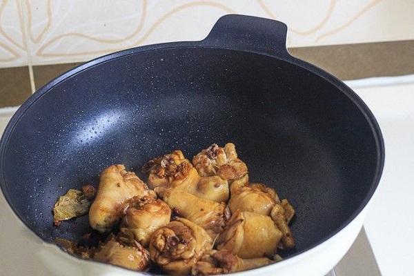 - Bước 3: Cho đùi gà vào đảo đều cho đến khi gà chuyển màu và xém cạnh. Thêm nước tương, đường phèn vào đảo đều.
