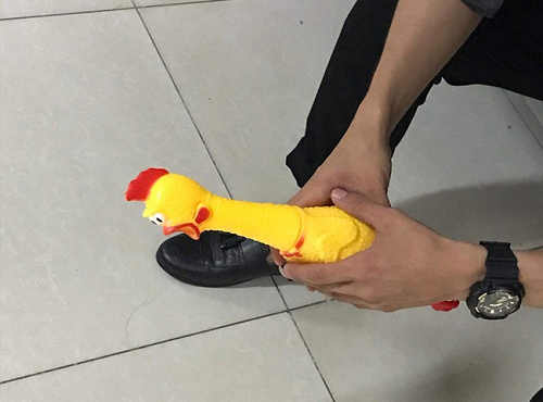 Mới đây, trên mạng xã hội xuất hiện hình ảnh ghi lại cảnh một anh chàng ngồi gục mặt xuống đất, trên tay cầm con gà nhựa màu vàng tại phòng chờ sân bay Nội Bài, cùng dòng chia sẻ đầy cảm động: