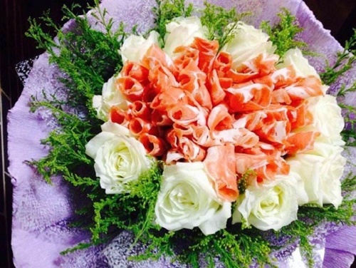 | Bó hoa được xếp từ những lát thịt sống vẫn được nhiều người đánh giá cao. |