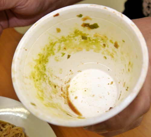 | Đám mốc xanh lè bám ở bên thành cốc mì. |