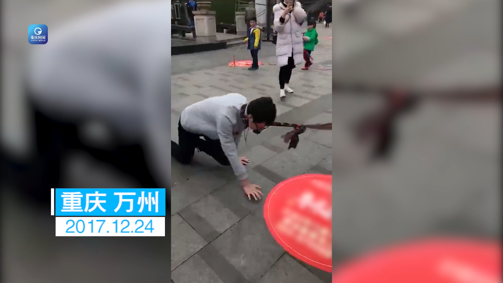 Trong clip có thể thấy, anh chàng mặc chiếc áo tối màu, đeo kính đen đang quỳ bò trên đường, trên cổ anh ta còn có sợi dây buộc qua, được một cô gái dắt đi. Người đi đường thời điểm bấy giờ đều tỏ ra hiếu kỳ trước sự việc ‘lạ’ này, nhiều người đã nhanh tay rút điện thoại ra chụp ảnh, quay video cảnh tượng chéo ngoe này.