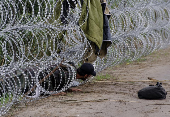Một người di cư trườn qua hàng rào kim loại gần làng Roszke tại biên giới Hungari-Serbia ngày 26/8. Ảnh: AFP |