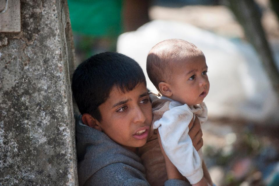 Một cậu bé di cư và em trai nhỏ chờ đợi tại Gevgelija, thị trấn biên giới giữa Macedonia và Hy Lạp. Ảnh: AFP |