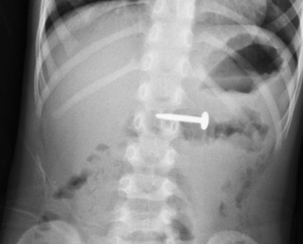 Ngày 27/3, khoa Khám bệnh Cấp cứu lưu, tiếp nhận bé Phạm Trung D. (5 tuổi), thường trú tại Móng Cái, Quảng Ninh. Bé vào viện trong tình trạng đau tức ngực, đau bụng, ho nhiều sau khi nuốt phải một chiếc đinh ốc vít.