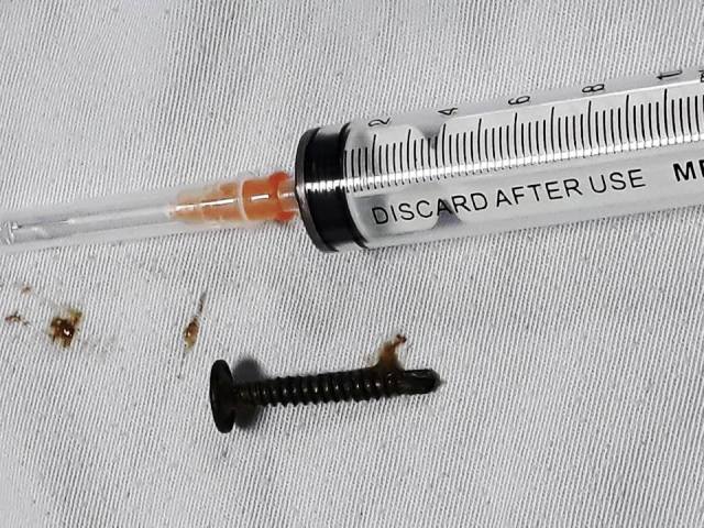 Chiếc đinh vít đươc lấy khỏi cơ thể bệnh nhi - Ảnh: BVCC. |