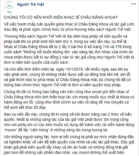 Trước đó, vào ngày 10/1, đơn vị này gửi văn bản cho Châu Đăng Khoa, yêu cầu nhạc sĩ này trong thời hạn 5 ngày gửi lời xin lỗi đến mình và nhà thơ Thùy Linh (tên thật của Linh Linh). Văn bản nhấn mạnh phía NXB không yêu cầu bồi thường vật chất nhưng mong nhận được lời xin lỗi vì hành vi xâm phạm bản quyền hai bài thơ.
