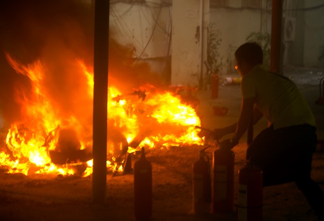 Một người dùng bình bọt dập lửa tại nhà để xe Đại học Quốc gia. Ảnh: Tri thức trực tuyến. |